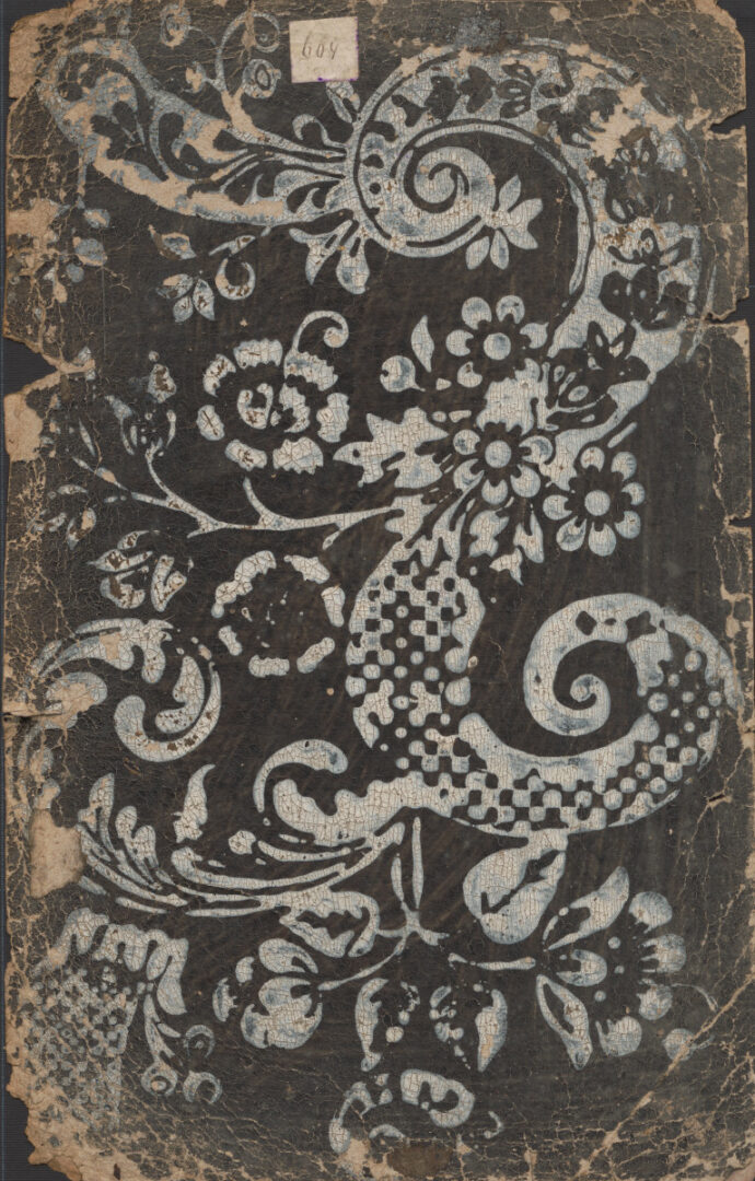 Vzorkovník modrotlače – hárok kartónu s otlačeným bielym vzorom. Okraje hárku sú poškodené. 1. strana: celoplošný kvetinový ornamentálny motív zložený z troch veľkostí kvetín so stonkou a lístkami. Vo vrchole nalepené číslo 603. 2. strana: celoplošný masívny ornamentálny motív tvaru veľkého „S“ s rokajmi a volútami, doplnený veľkými kvetmi. Vo vrchole nalepené číslo 604.