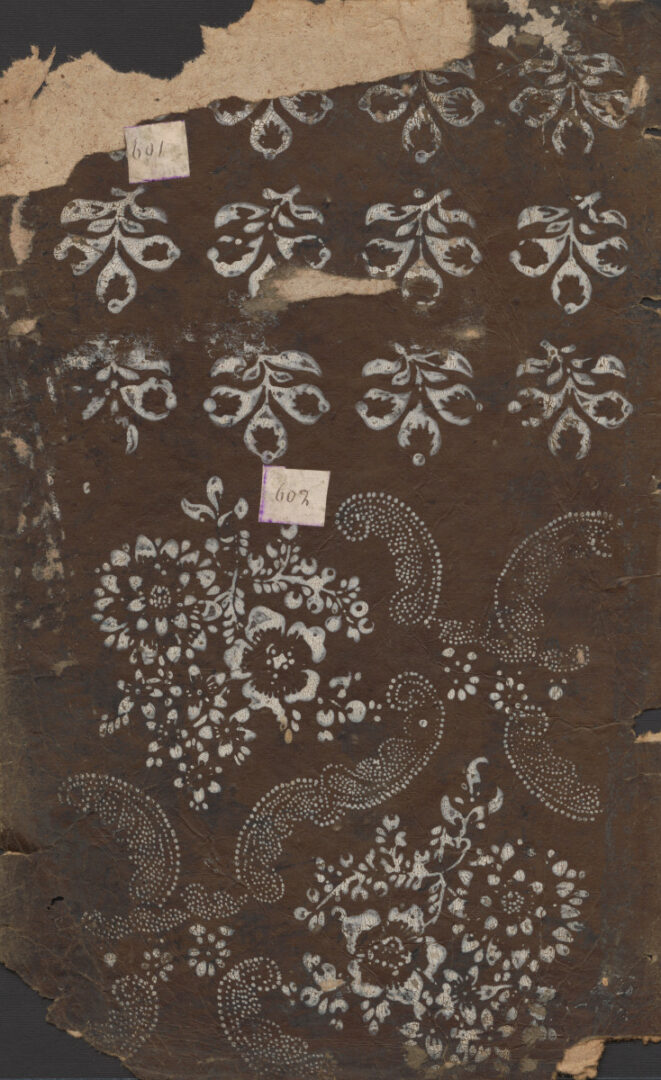 Vzorkovník modrotlače – hárok kartéónu s otlačeným bielym vzorom. 1. strana: celá plocha zdobená dvomi veľkoplošnými kvetinovými motívmi s množstvom úponkov a lístkov. Pravá horná časť odtrhnutá, nalepené šíslo 600. 2. strana: plocha horizontálne rozdelená na dve polia – v hornom poli sú symetricky rozmiestnené rovnaké rastlinné motívy vetvičiek so stopkami smerujúcimi hore a listami dole. V dolnom poli dva veľkoplošné identické kyticové motívy s vybodkovanými meandrami medzi sebou. Vhornej časti pod odtrhnutým okrajom nalepené číslo 601, uprostred číslo 602.