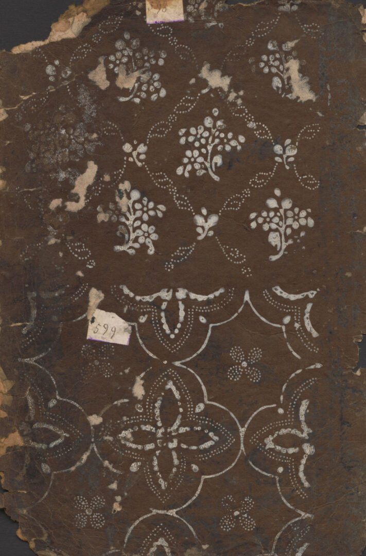 Vzorkovník modrotlače – hárok kartónu s otlačeným vielym vzorom. 1. strana: Vrchná čast hárku odtrhnutá, uprostred nalepené číslo 597. Plocha horizontálne rozdelená na dve polia – v hornom tvora výzdobu dva identické veľkoplošné, zrkadlovo usporiadané kvety. – v dolnom pravidelný sieťový vzor s drobnými dvojkvetinovými kytičkami s bodkovanými vlnovkami okolo. 2. strana: plocha horizontálne rozdelená na dve polia. V hornej časti nalepené číslo 598. výzdobu tvoria bodkované kosoštvorce v strede ktorých sú stonky s kvietkami. Spodná časť zdobená čtvorcípými hviezdicami v bodkovaných rámčekoch s plnýni kontúrami. V medzipoliach bodkované štvorlístky. Uprostred nalepené číslo 599.