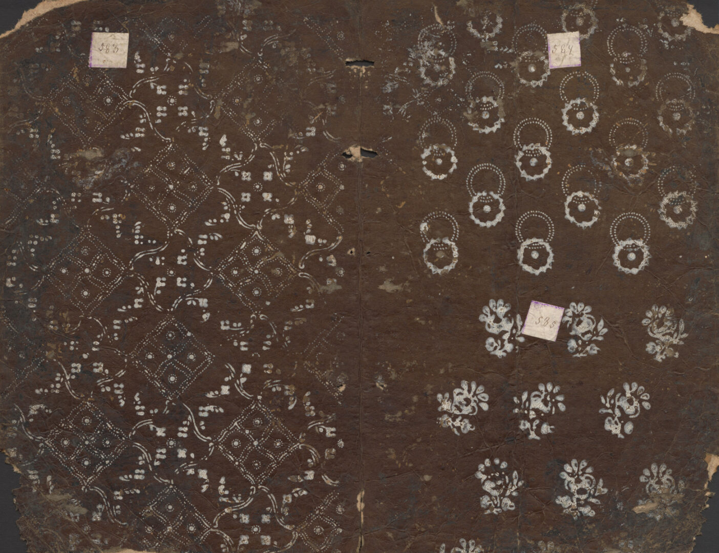 Vzorkovník modrotlače – dvojhárkový kartón s otlačeným bielym vzotrom. 1. predná strana: v hornej časti nalepené číslo 581, v strede číslo 582. Celá plocha je rozdelená horizontálne na dva ozdobné motív – hore: symetrická kompozícia šesťcípych hviezd v bodkovaných špirálovitých rámčekoch, – dole: štvorice bodkovaných slučiek, medzi ktorými je štylizovaný bodkovaný kvet. Ornament dopĺňajú bodkované volúty. 2. strana: v hornej časti nalepené číslo 583. Celá plocha úpokrytá symetrickým „sieťovým“ vzorom zloženým z drobných bodkovaných štvorčekov, vlnoviek a ratolestí. 3. strana: plocha horizontálne rozdelená na dve polia – horné zdobí symetrická kompozícia bodkovaných dvojstenných krúžkov , čiastočne prekrytých ozubenými kolieskami s bodkou v strede.vo vrchole nalepené číslo 584. – spodné zdobia symetricky rozmiestnené drobné identické kvietky so stonkami. uprostred nalepené číslo 585. 4. strana: plocha horizontálne rozdelená na dve polia – horné zdobené celoplošne drobnými štylizovanými lipovými kvetmi. Vo vrchole nalepené číslo 586. – spodné zdobené symetricky rozmiestneným motívom striedajúcich sa menších a väčších drobných bodkovaných kvetov. V strede nalepené číslo 587.