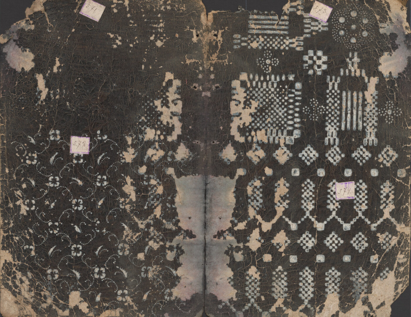 Vzorkovník modrotlače – dvojhárkový kartón s otlačeným bielym vzorom 1. strana: Celá plocha pokrytá geometrickými ornamentálnymi motívmi zloženými z drobných štvorčekov, obdňlžnikov, bodiek a čiarok. 2. strana: pôvodne celá plocha (v súčasnosti zachovaná je len časť) pokrytá drobnými štvorlupienkovými kvietkami, ktoré sú medzi sebou po diagonále pospájané vybodkovanými oblúčikmi. Povrch s potlačou je na celej ploche značne poškodený. 3. strana: Potlačená plocha sa skladá z dvoch vzorov, v hornej časti sú to geometrické ornamentálne motívy zložené z bodiek, štvorčekov, liniek a obdĺžnikov pospájaných do jednotlivých väčších obrazcov, spodnú časť tvoria dva horizontálne symetrické pásy so štylizovaných „hroznov“, v spodnej časti pospájaných bodkami so štvorčekmi, pod ktorými sa nachádzajú voľné kosoštvorce z bodiek a pod nimi pás voľných štvorčekov. Aj na tejto strane je potlač značne poškodená. 4. strana: Potlačená plocha sa skladá z dvoch vzorov horizontálne rozdelených. Vrchná časť predstavuje geometrické ornamentálne motívy z bodiek, čiarok a štvorčekov, pospájaných do jednotnej sieťovej kompozície. Spodná časť predstavuje ornamentálne motívy vo vertikálnych pásoch z kosoštvorcov, striedajúcich sa so štylizovanými kvetmi. Vertikálne pásy sú medzi sebou oddelené bodkovanými vlnovkami. Pod potlačou je zlatá značka železničnej spoločnosti – zlatý kruh s iniciálami „BRB“ (Bayerische Regiobahn?).
