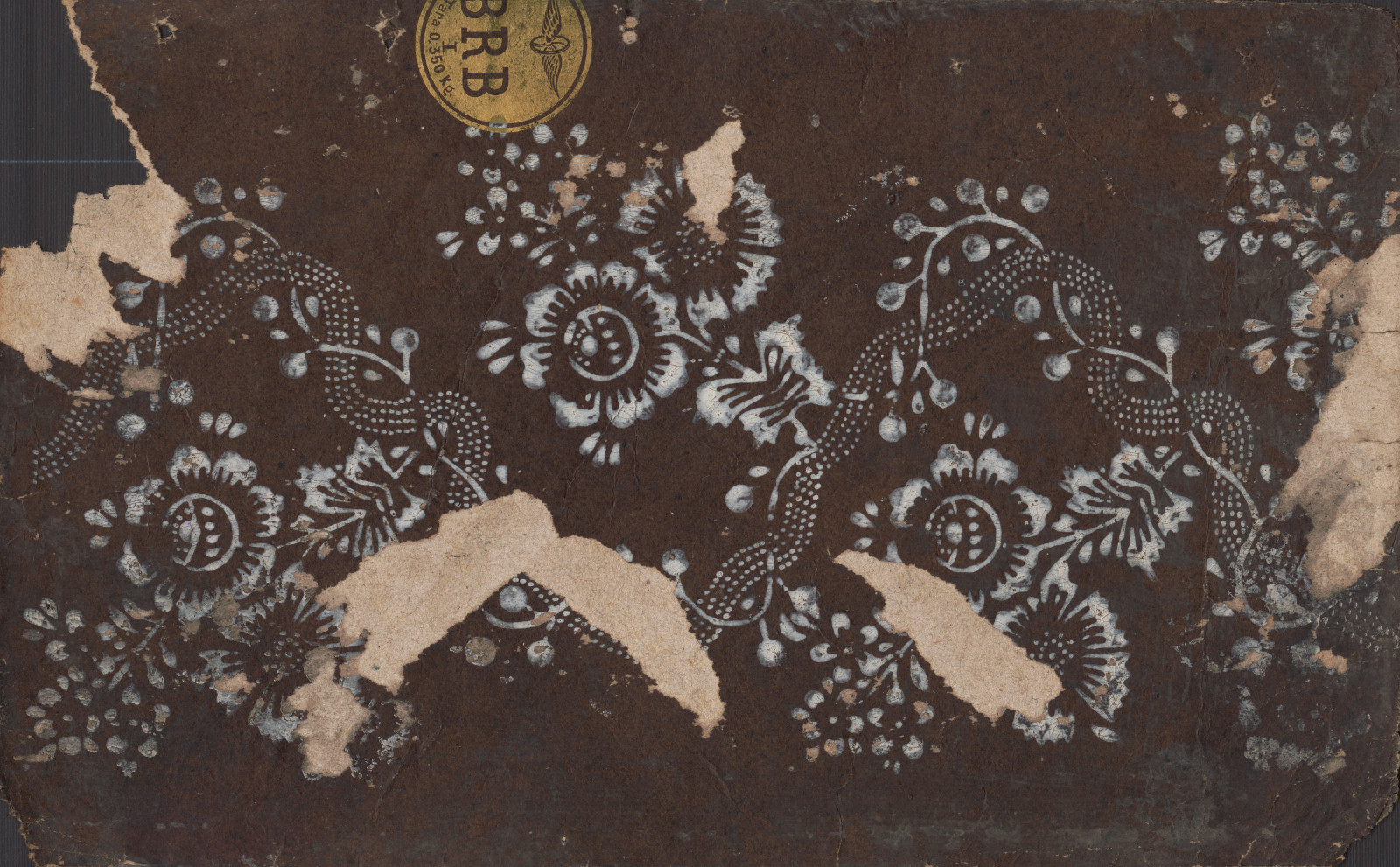 Vzorkovník modrotlače – hárok kartónu s otlačeným bielym vzorom 1. predná strana: celoplošný symetrický dekor zložený z drobných štvorlístkov 2. zadná strana: stredom plochy prechádza vertikálny zvlnený vybodkovaný pás ovinutý rozvilinou, v plochách meandrov sú umiestnené veľkoplošné kyticové motívy. – pravý horný roh odtrhnutý, rovnako strhnutý vzor aj na viacerých miestach strany (4).