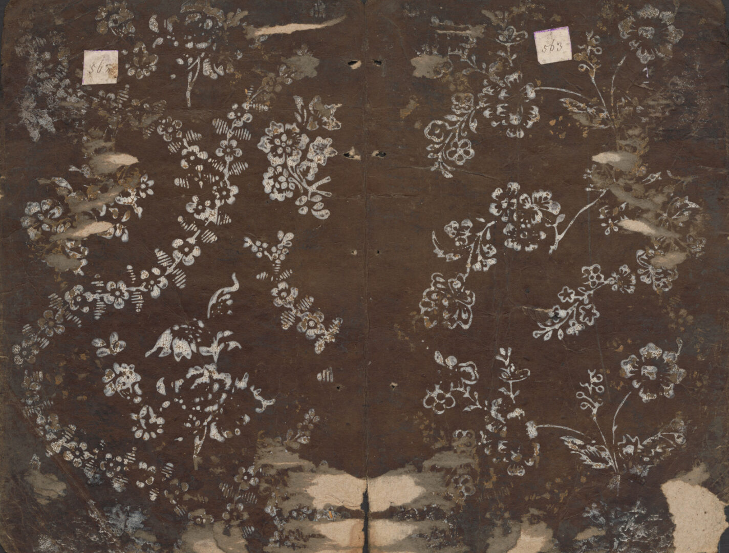 Vzorkovník modrotlače-dvojhárkový kartón s otlačeným bielym vzorom 1.predná strana: 4 vertikálne identické pásy zložené zo striedajúcich sa dvoch rastlinných motívov: bodkovanej ratolesti a trojkvetovej rastlinky so stopnkou a lístkami. – spodná časť s čiastočne strhnutou potlačou. 2. strana: celá plocha pokrytá meandrom z kvetov, v priestoroch okolo sú voľne rozmiestnené rôzne varianty kvetinových motívov. – spodná časť s čiastočne strhnutou potlačou. 3. strana: jemný celoplošný rastlinný motív dvojice rozvinutých väčších kvetov spojených tenkými úponkami s lístkami a drobnými kvietkami. – spodná časť s čiastočne strhnutou potlačou. 4. zadná strana: celoplošná výzdoba s pravidelným drobným dekorom v podobe štylizovaného päťlístkového kvetu s bodkovaným kruhom v spodnej časti s bodkou uprostred.