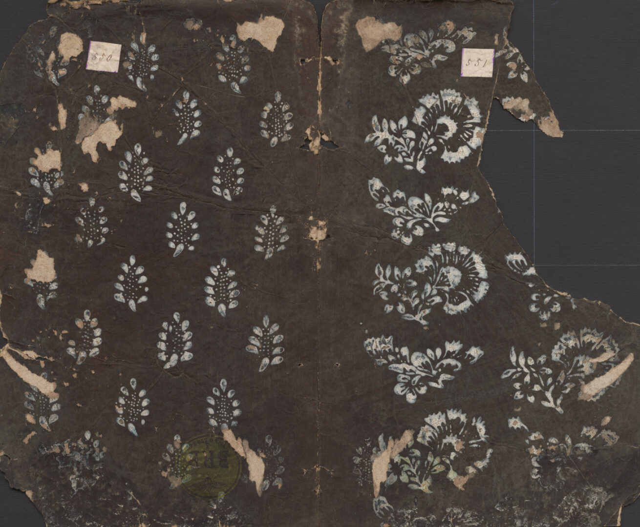 Vzorkovník modrotlače, dvojhárkový kartón s otlačeným bielym vzorom: 1. predná strana: 6 identických vertikálnych radov z drobných štylizovaných trojkvietkov na stonke s dvomi lístkami. Miestami vytrhané tmavé časti povrchu. 2. strana: 6 identických vertikálnych pásov štylizovaných stromčekov z menších a väčších bodiek. 3. strana: 2 vertikálne pásy veľkých štylizovaných karafiátov s drobnejšími medzirastlinkami. Štvrtina strany (listu) vpravo hore odtržená 4. zadná strana: rozvilinový motív s veľkými kvetmi a listami, doplnený mnoýžstvom bodkovaných úponkov a lístkov.