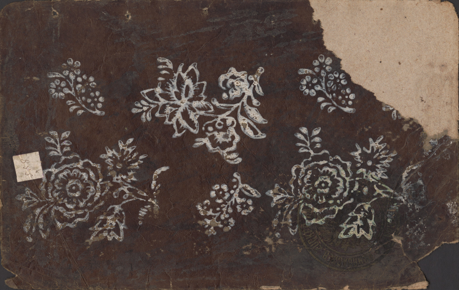 Vzorkovník modrotlače, 1.hárok kartónu s otlačeným bielym vzorom: 1. strana: Celá plocha pokrytá drobnými štylizovanými štvorlupienkovými kvietkami so stonkami a lístkami 2. strana: štylizované jednotlivé veľké rozvinuté kvety ruže, striedajúce sa s drobnejšími kvietkami so stonkami a lístočkami zloženými s kvapkovitých a bodkovitých komoponentov.