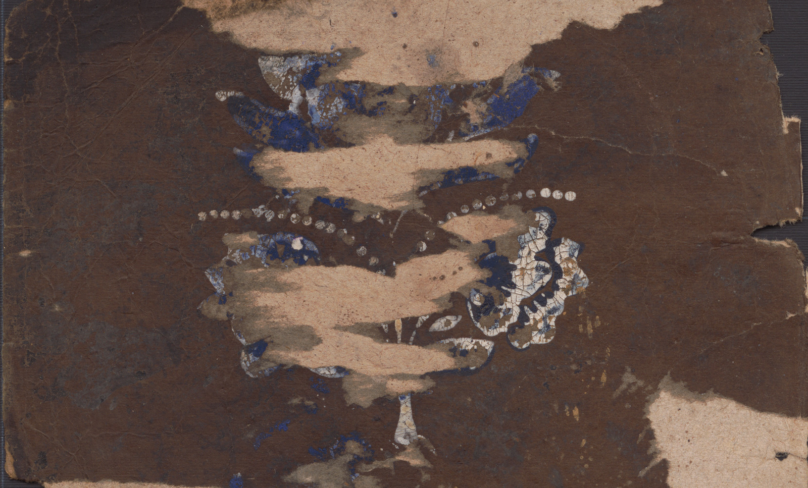 Vzorkovník modrotlače, fragment hárka kartónu s obojstranne otlačeným bielym vzorom: 1. strana: ťažko identifikovateľný rastlinný motív bodiek a kriviek s modrým dofarbením, uprostred nalepené číslo 690. 2. strana: strana hárku nesie stopy po centrálnom kvetinovom motíve zloženého z troch veľkých kvetov dofarbovaných modrou farbou. Večšina povrchu kartónu s ornamentálnym motívom je strhnutá.