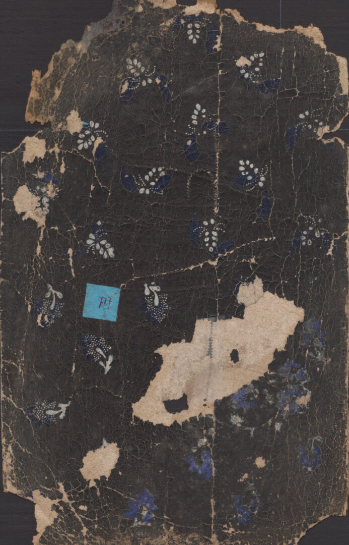 Vzorkovník modrotlače, hárok kartónu s obojstranne otlačeným bielym vzorom: Kartón so značne zdevastovaným horným okrajom. 1. strana: plocha horizontálne rozdelená na dve polia: horné s identickými rastlinnými motívmi – vybodkované stonky s lístkami, čiastočne prefarbené na modro. Medzi nimi zlatá pečiatka Bavorskej regionálnej železnice (BRG). Uprostred nalepené číslo 715. V spodnej časti polia ornamentálny motív identických „strapcovitých “ kvetov s modrou dofarbením. 2. strana: Celá plocha s množstvom poškodení potlačeného povrchu je horizontálne rozdelená na dve polia – horné s identickými drobnými štylizovanými kvetinovými motívmi v podobe ratolestí s modrým dofarbením, spodná časť s vytrhnutou plochou zdobená štylizovanými trojlístkami s vybodkovanými a miestami namodro dofarbenými kvietkami. Nalepené číslo 717.