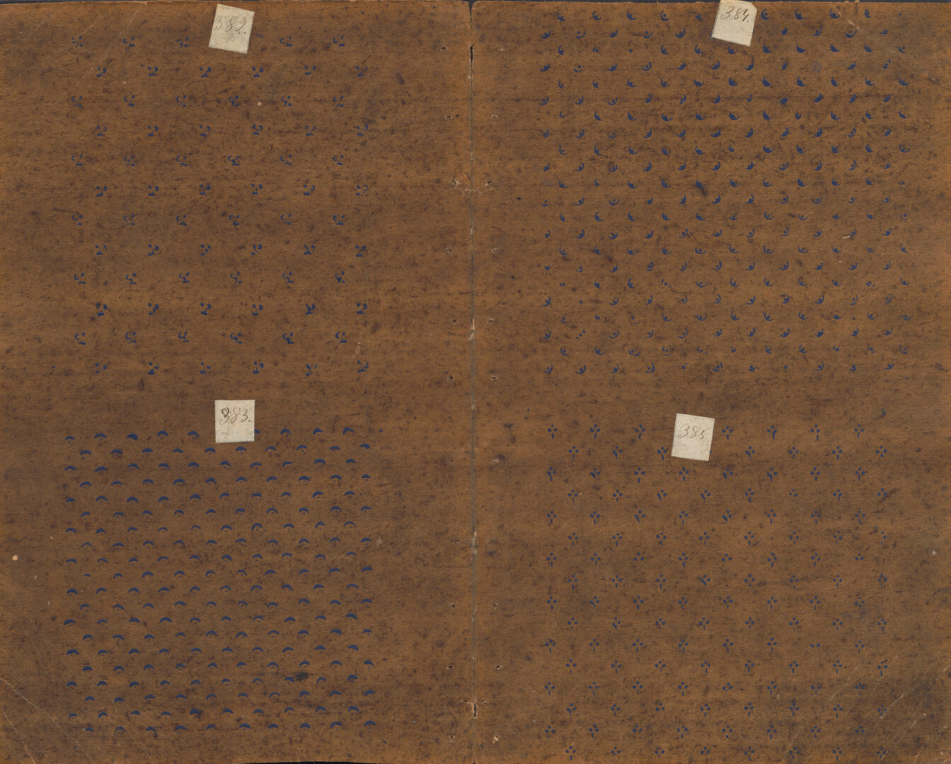 Vzorkovník modrotlačový, kartónový dvojhárok potlačený na 4 stranách modrým vzorom. 1. predná strana: potlačená plocha horizontálne rozdelená na dve polia – horné: v diagonálnych pásoch zrnká a bodky, uprostred nalepené číslo 380. – dolné: v diagonálnych pásoch drobné štylizované útvary z bodiek (tri menšie a dve väčšie), uprostred nalepené číslo 381. 2. strana: potlačená plocha horizontálne rozdelená na dve polia – horné: v diagonálnych pásoch drobné, bližšie nešpecifikovateľné útvary, vo vrchole nalepené číslo 382. – dolné: v diagonálnych pásoch štylizované drobné útvary, zložené z bodky a oblúčika nad ňou. V strede nalepené číslo 383. 3. strana: potlačená strana horizontálne rozdelená na dve polia – horné: v diagonálnych pásoch drobný ornamentálny motív zložený z oblúčika a bodky v strede. Nad nimi nalepené číslo 384. – dolné: v diagonálnych pásoch drobný ornamentálny motív trojlístkov na stonke. Uprostred nalepené číslo 385. 4. strana: potlačená strana horizontálne rozdelená na dve polia – horné: v diagonálnych pásoch drobný ornamentálny motív zložený z piatich bodiek. Uprostred hore nalepené číslo 386. -spodné: v diagonálnych pásoch drobný ornamentálny motív „halúzok“ s lístkami. Uprostred nalepené číslo 387.
