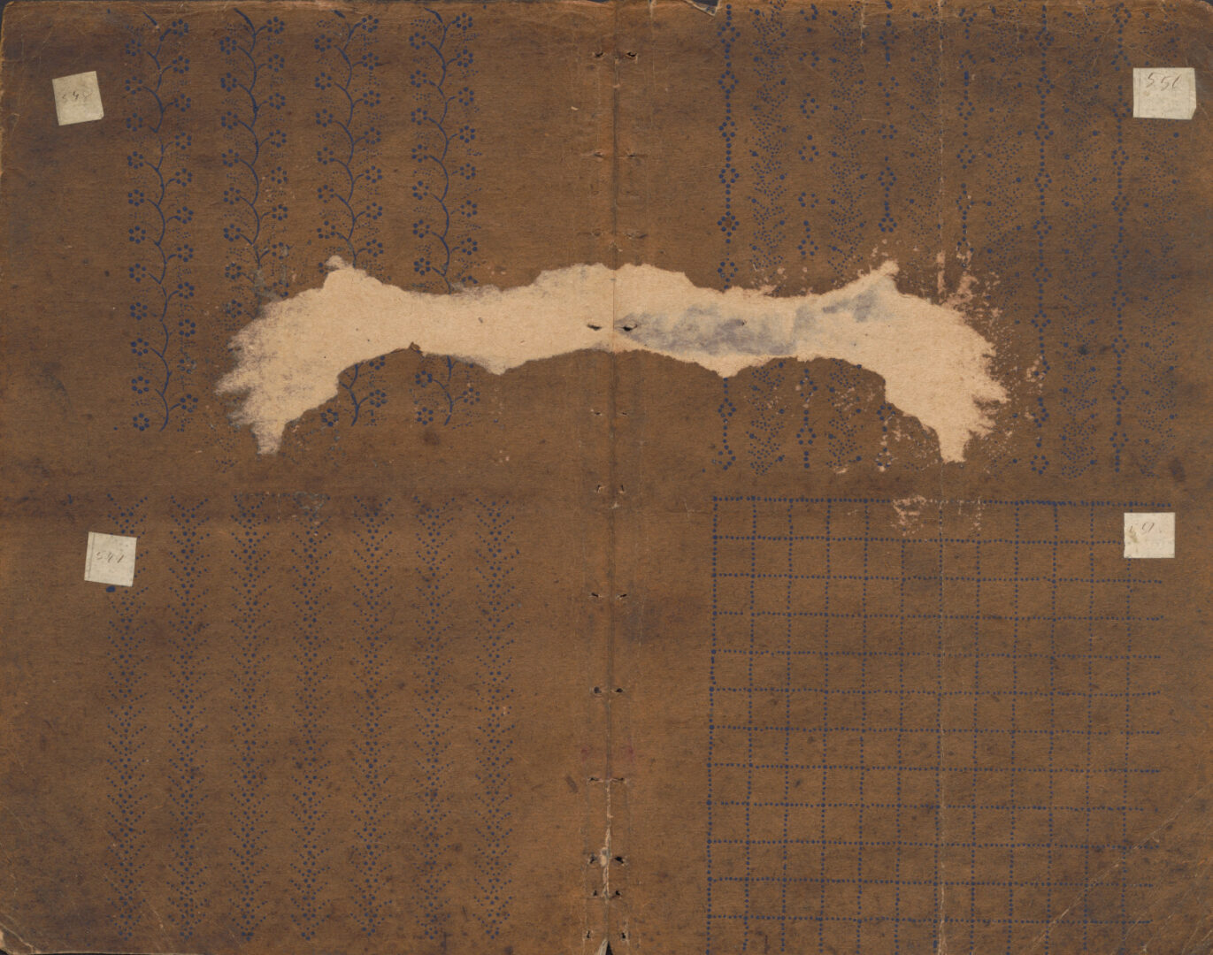 Vzorkovník modrotlačový, kartónový dvojhárok potlačený na 4 stranách modrým vzorom. 1. predná strana: potlačená plocha horizontálne rozdelená na dve polia – horné: jednoduchý pravoúhly mrežovitý vzor, vpravo hore nalepené číslo 546. – dolné: pole je zdobené v podobe buniek včelieho plástu. Vpravo nalepené číslo 547. 2. strana: potlačená plocha horizontálne rozdelená na dve polia – horné: vo vertikálnych pásoch dvojrady kvetov spojených linajkami. Časť polepu strhnutá. Vľavo hore nalepené číslo 548. – spodné: vertikálne pásy „prasličiek“. Vľavo nalepené číslo 549. 3. strana: potlačená plocha horizontálne rozdelená na dve polia – horné: vo vertikálnych pásoch sa striedajú bodkovaná reťaz a „prasličkový“ pás.Vpravo hore nalepené číslo 550. – spodné: v ploche pravouhlý mrežovitý vzor z drobných bodiek. Vpravo nalepené číslo 551. 4. strana: potlačená plocha horizontálne rozdelená na dve polia – horné: vo vertikálnych pásoch 4 rovnobežky v zväzku po päť. Vľavo hore nalepené číslo 552. – spodné: „parketový“ vzor z trojíc rovnobežiek „cik-cakovito“ usporiadaných. Vľavo nalepené číslo 553.