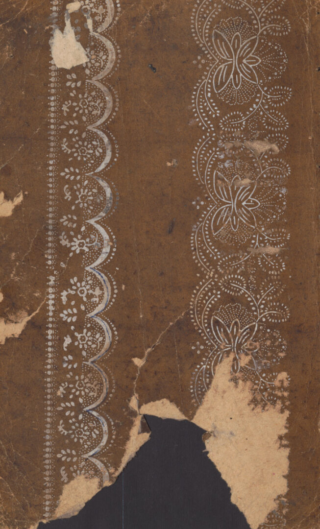 Vzorkovník modrotlačový, kartónový hárok potlačený bielym vzorom.Spodný okraj s vytrhnutým stredom. 1. predná strana: potlačená plocha vertikálne rozdelená na dva pásy: ľavý – dvojice listov preložené dvojicami kvetov v ladných krivkách, pravý – dvojice „ozubených“ listov preložené trojicami kvetov v ostrých krivkách. 2. zadná strana: plocha vertikálne rozdelená na dve polia – ľavé: bordúra s poloblúčikmi na pravej strane a s rovným ľavým okrajom z bodiek, pravé: pás „filigránskych“ kvetov, úponkov a listov, pravidelne sa striedajúcich.