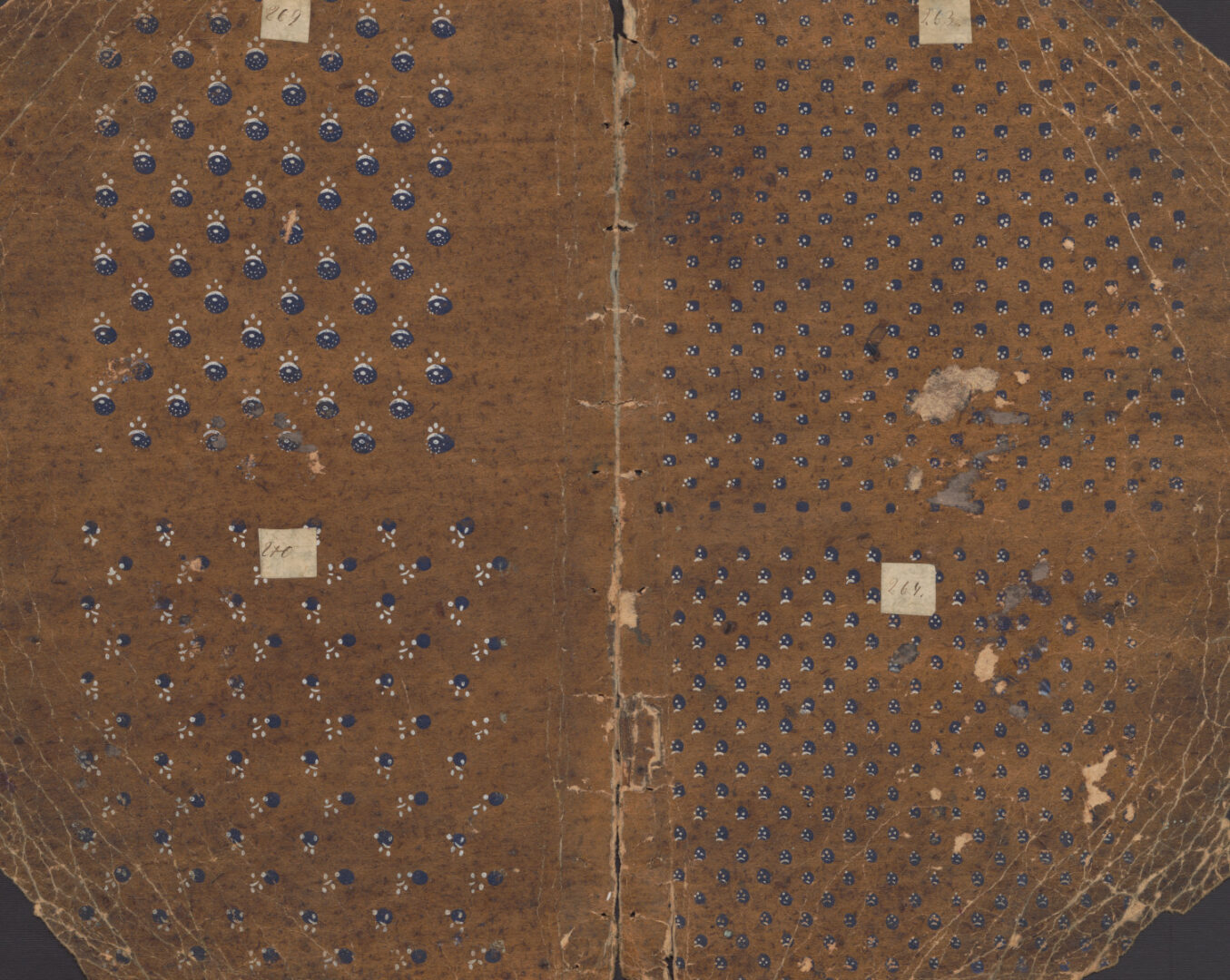 Vzorkovník modrotlačový, kartónový dvojhárok potlačený na 4 stranách 1. predná strana: potlačená plocha horizontálne rozdelená na dve polia – horné: v diagonálnych pásoch pätice bodiek v tvare štylizovaného kvietku, striedajú pásy s tými istými kvietkami, no každý druhý tvorí drobné modré políčko s štvoricou bielych bodiek v oblúčiku.- dolné: v diagonálnych pásoch drobné štylizované hroznovité útvary z bielych bodiek na modrom podklade. 2. strana: potlačená plocha horizontálne rozdelená na dve polia – horné: v diagonálnych pásoch drobné útvary zložené zo základného modrého kruhového polia s drobnými bielymi bodkami v jeho spodnej časti nad nimi biely oblúčik a nad ním v hornej časti mimo modrého polia trojica bodiek. – dolné: v diagonálnych pásoch štylizované drobné kvietky zložené z bielych bodkovaných stoniek a lístkov, vlastný kvet tvorí modrá bodka. 3. strana: potlačená strana horizontálne rozdelená na dve polia – horné: v diagonálnych pásoch drobný ornamentálny motív zložený z modrého kruhového polia a štyroch bielych bodiek na ňom. -dolné: v diagonálnych pásoch drobný ornamentálny motív zložený z trojice bielych bodiek na bielom poli s poloblúčikom v sopodnej časti. 4. strana: potlačená strana horizontálne rozdelená na dve polia – horné: v diagonálnych pásoch drobný ornamentálny motív zložený zo štylizovaného kvetu so stonkou a lístkami z bielych bodiek, pričom samotný kvet je na modrom kruhovom podklade. – dolné: v diagonálnych pásoch drobný ornamentálny motív samostatných kvetov zložených z bielych bodiek na modrom kruhovom podklade.
