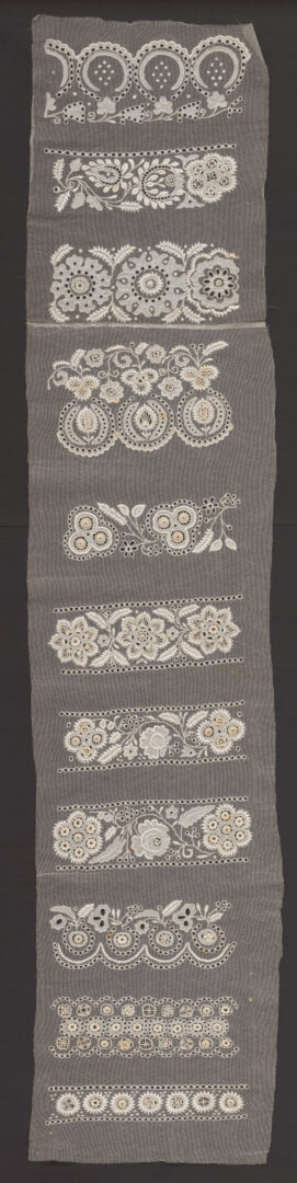 11 rôznych výšiviek vyšitých na tyle, použité techniky – gatry, hladkovanie, kierková vášivka, aplikácia bielym plátnom.