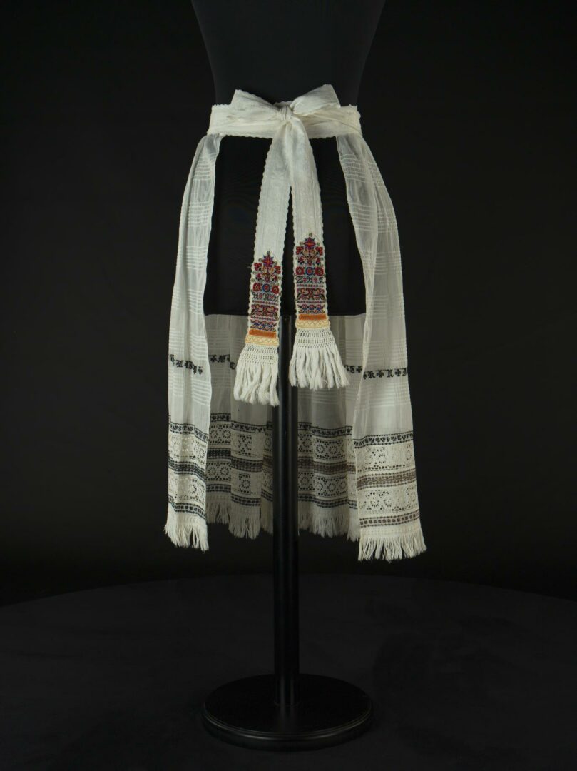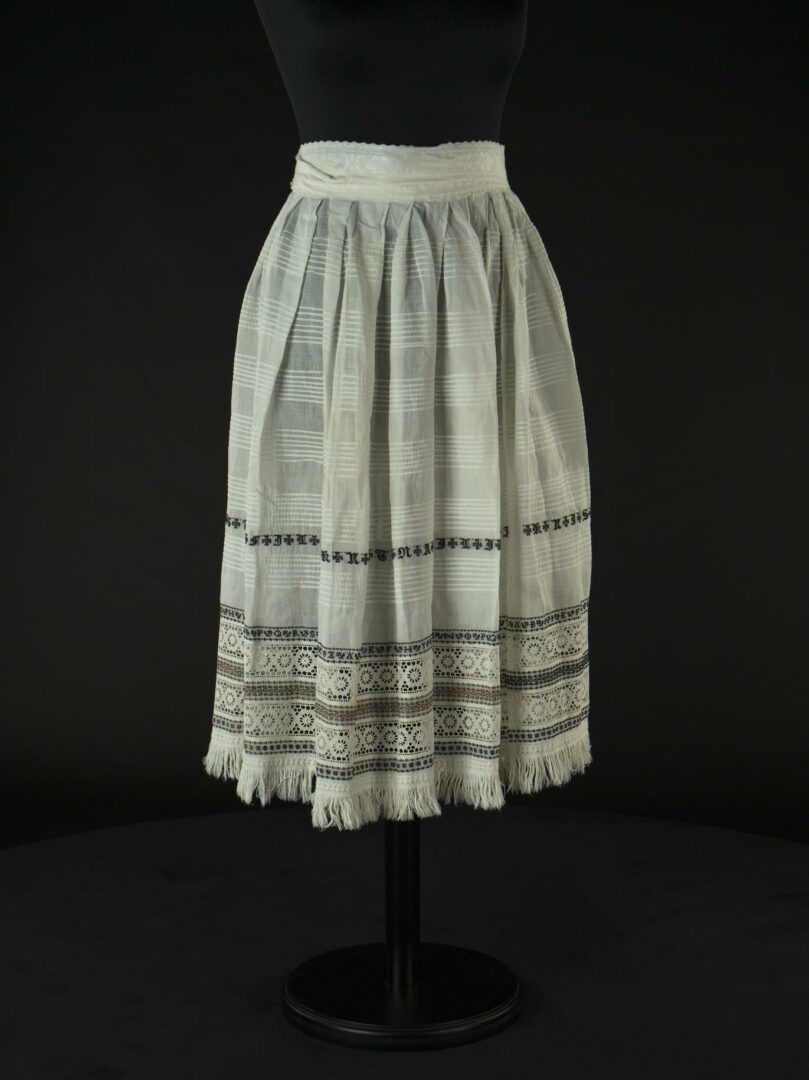 Zástera je ušitá z tenkej bavlnenej látky (vapér alebo organtín). Vyšitá je krížikmi. Do horného radu výšivky je zakomponované meno nositeľky – Kristíny Filipkovej. Medzi radmi krížikovej výšivky je všitá biela strojová výšivka, madeira. Zástera je členená radmi úzkych zámikov, ktoré sú šité ručne. V hornej časti je zástera poskladaná do hlbokých záhybov, ktoré sú preštepované strojom. K zástere sú prišité široké bavlnené tkanice, ukončené výšivkou a uviazanými strapcami. Výšivka je krížiková, doplnená dierkami a lístkami, vyšitými naplno. Výšivku dotvárajú našité kovové ozdoby.