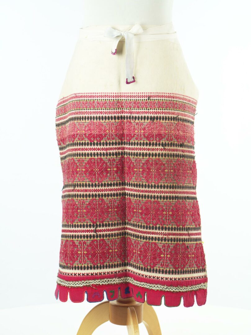 Zástera je z ručne zhotovenej tkaniny. Osnova je z bielej bavlny, útok tvorí farebná bavlenná priadza. Dolný okraj tvoria zuby ušité z červeného bavlneného plátna. Okraje zubov sú obslučkované farebnou priadzou. na prostredných štyroch zuboch sú vyšité písmená: M J L A. K zástere sú prišité viazačky, biela keprovka.