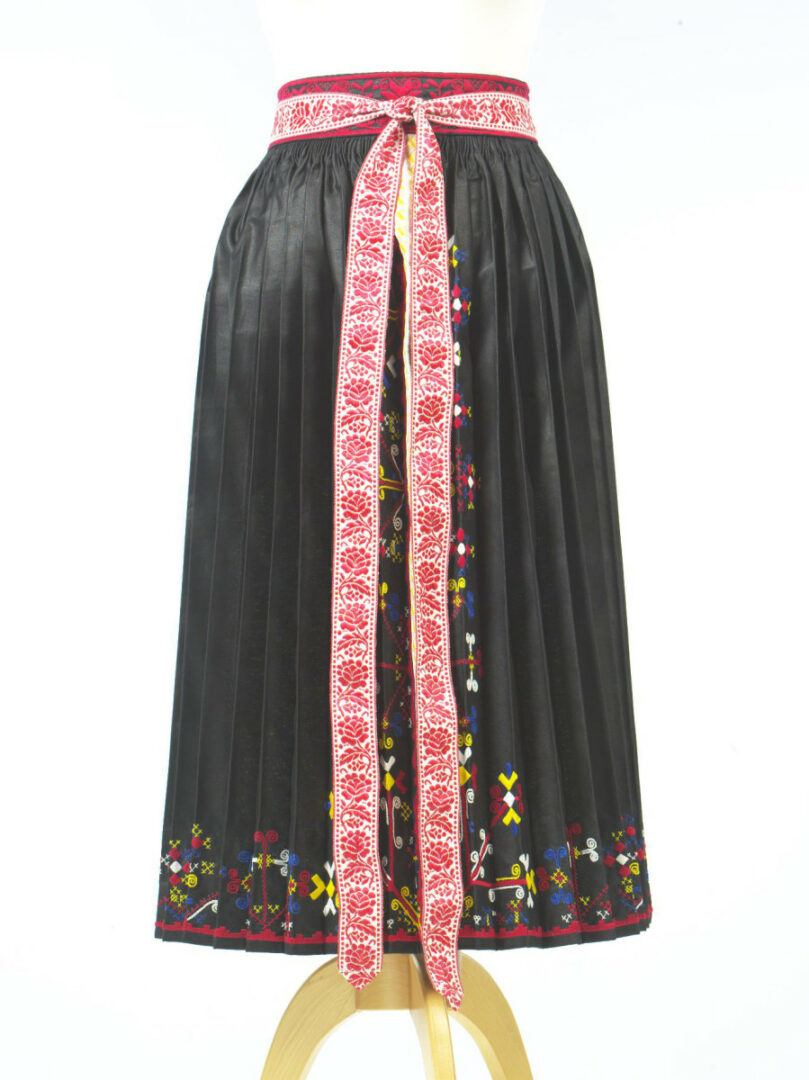 Ušitá je z dvoch pôl čierneho glotu, cez švík je našitá bielo-žltá tkanica. Predkreslená výšivka je umiestnená v strede zástery, na dolnom okraji a na obalku. K obalku je prišitý bielo-červený povijan.
