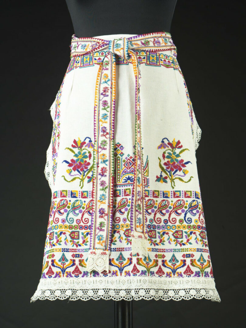 Zástera z bavlnenej kanavy je vyšitá vrkôčikovým krížikom pestrými farbami. Olemovaná je bielou strojovou výšivkou. Viazačky zástery sú z toho istého materiálu, dookola sú obslučkované a celá plocha viazačky je tiež vyšitá krížikmi.