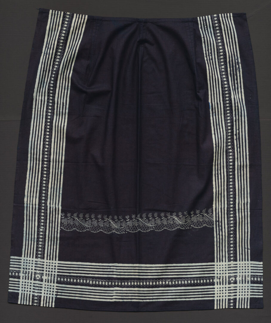 Ženská modrotlačová obojstranná zástera vyrobená z jednej šírky bavlneného plátna. Na lícnej strane je na troch stranách zástery bordúra široká 10 cm. Bordúru tvoria úzke pásiky, ktoré sú v strede prerušené drobným vzorom v tvare tulipánov. Vzor v strednej časti zástery tvorí úzky rastlinný motív. Na rubovej strane je rovnaká bordúra ako na lícnej strane. Iný je vzor v strednej časti, ktorý tvoria skupiny drobných kvietkov s malými aj veľkými listami. Zástera je bez tkaníc, ktoré slúžia na uviazanie okolo pása. Je nepoužívaná.