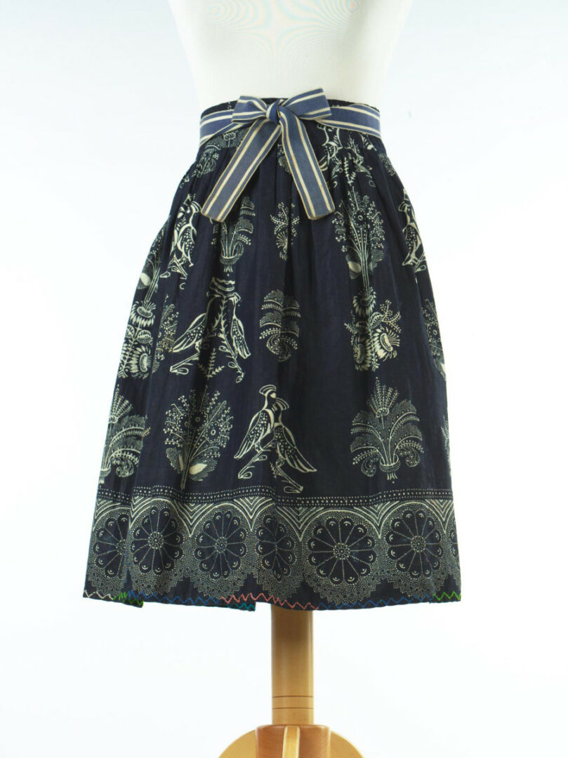 Zástera je z modrotlače s bielym vzorom, na lícovej a rubovej strane rôznym, takže sa mohla používať obojstranne. Na dolnom okraji je urobená záložka, cez ktorú je vyšitá retiazka v tvare cik-cak. Šitá je farebnou vlnenou priadzou. V páse je zástera naskladaná a všitá do obalka z modrotlače, ku ktorému sú prišité viazačky.