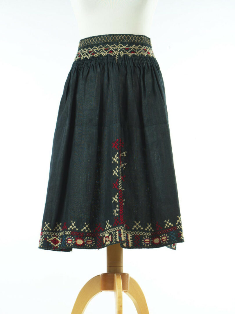 Zástera je zhotovená z domáceho ľanového plátna zafarbeného na tmavomodro. Dve poly plátna sú zošité spojovacím švíkom. V páse je zástera naskladaná do záhybkov, ktoré spevňuje výšivka. Výšivka na zástere je šitá vlnenou priadzou. Použité stehy: krížik, hladkovanie, retiazka. Zástera nemá viazačky