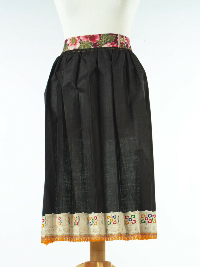 Zástera je ušitá z jednej poly farbiarskeho plátna, dolný okraj má vyšitý hrubšou bavlnenou priadzou. Geometrický ornament je vyšitý plným plochým stehom, okraje sú obslučkované. K obslučkovanému okraju je prišitá paličkovaná čipka. V páse je zástera nabraná a všitá do obalka zo vzorovaného kartúnu. Viazačky sú zo zástery odstrihnuté