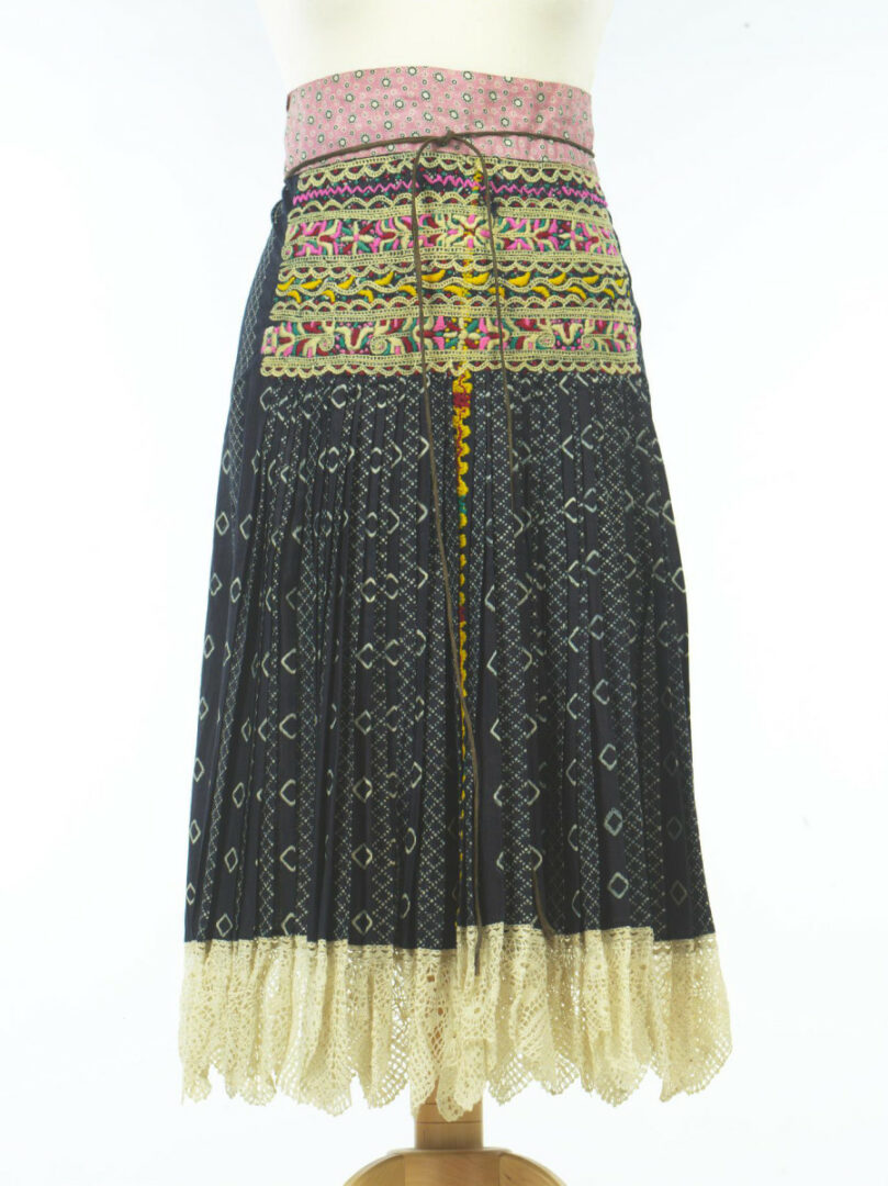 Predná ženská zástera je z dvoch pôl modrotlače tlačenej na továrenskom plátna. Poly sú zošité spojovacím švíkom vlnou. Dolný okraj lemuje mnohopárová paličkovaná čipka, ktorá je k zástere prišitá pomocou textilných zúbkov. Čipka je upaličkovaná z dvoch hrúbok pravdepodobne bavlnenej priadze. Horná časť zástery je naskladaná, sklady spevňuje výšivka šitá vlnou. Použité stehy: krajčírska retiazka a plný steh. Horná časť zástery je všitá do širokého obalka z barchetu.