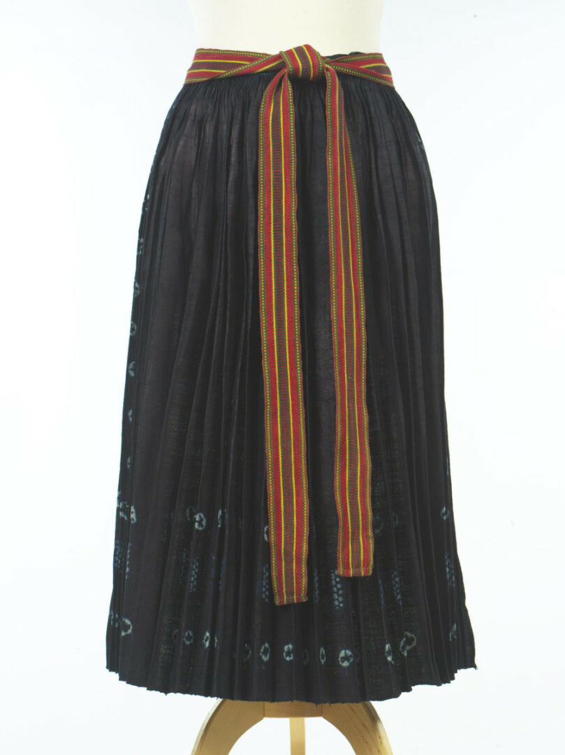 Zástera je z domáceho plátna. Na troch stranách má vyväzovaný vzor. Vyväzovanie si urobili ženy doma, zásteru im v indigu zafarbil farbiar vo Veličnej. Na zástere sú vyviazané „očká“ a „húsenice“. V páse je zástera nariasená a všitá do obalka z modrotlače so zeleným vzorom, z ktorej sa obyčajne šili sukne. K obalku sú prišité továrenske tkanice.