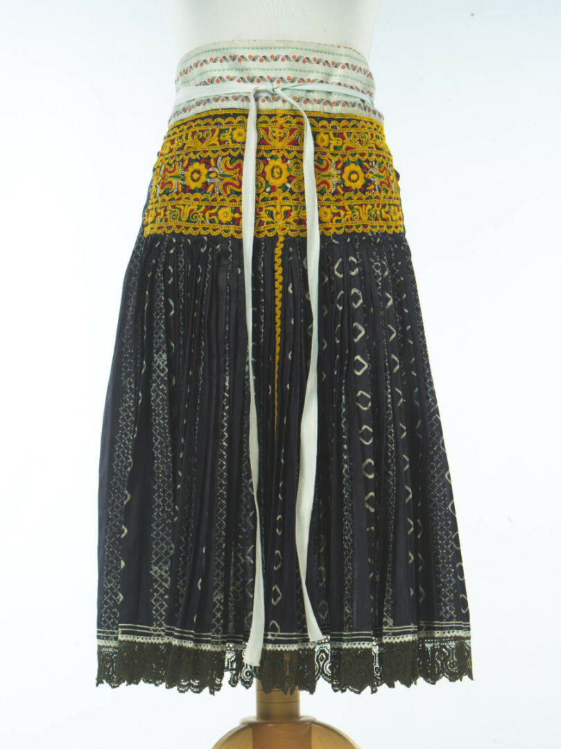 Dve poly modrotlače sú zošité spojovacím švíkom. Na troch krajoch zástery je prišitá hadovka a bavlnená továrenska čipka. zadná zástera zvykla mať čipku len na spodnom okraji. Horná časť zástery je naskladaná, cez sklady je urobená predkreslená výšivka. Šitá je hrubšou bavlnenou a vlnenou priadzou. Použitá je krajčírska retiazka, plný a stonkový steh, niektoré motívy sú vyšité slučkovacím stehom. Obalok zástery je z kartúnu.