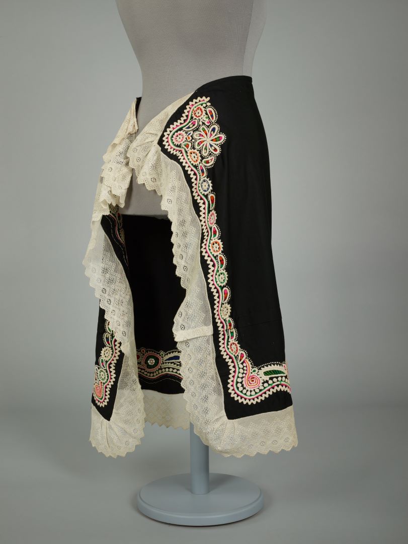 Zástera z glotu je na troch stranách vyšívaná hrubšou bavlnenou a farebnou vlnenou priadzou. Vzor výšivky je predkreslený. Použité stehy: plný plochý, stonkový, dierky, gatry. Výšivku po jednom okraji lemuje našitá textilná hadovka. Zásteru lemuje bavlnená továrenská čipka. Na zástere chýbajú viazačky. Na dolnej časti má zástera ušitý zámik.
