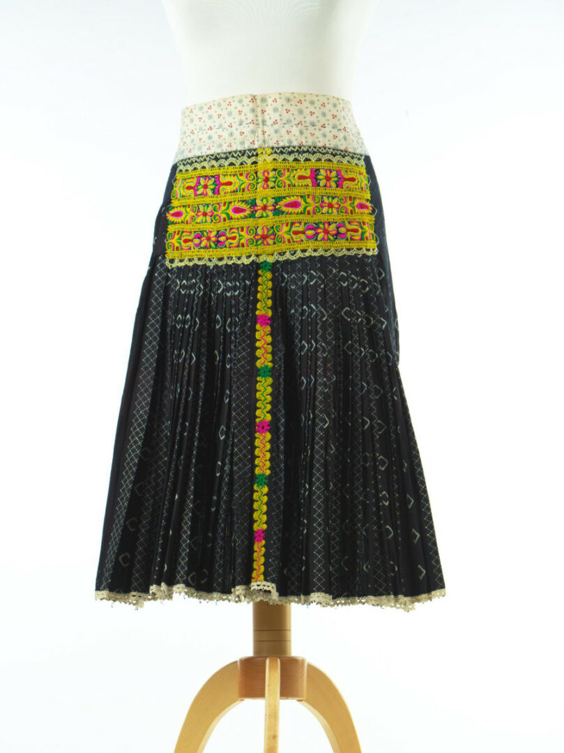 Zadná zástera je zhotovená z dvoch pôl modrotlače, ktoré sú zošité spojovacím švíkom. Švík je šitý vlnenou priadzou. Horná časť zástery je naskladaná a na skladoch je umiestnená predkreslená výšivka, ktorá je šitá vlnenou aj bavlnenou priadzou. Výšivka je robená plným a stonkovým stehom, jednotlivé pásy výšivky sú členené linkami krajčírskej retiazky. Zástera je všitá do obalka z kartúnu. Zástera má k dolnému okraju prišitú hadovku, ku ktorej bola pôvodne prišitá aj čipka.