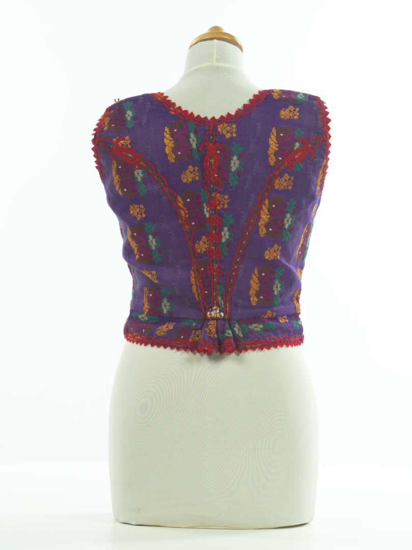 Živôtik je ušitý z brokátu, podšitý je domácim, ľanovým plátnom. Okolo výstrihu, zapínania, dolného okraja a prieramkov sú našité zúbky z červeného súkna. Okraje lemuje tenká harasová šnúrka, z ktorej je urobené šnurovanie na zadnom diele. Zapína sa na gombíky a dierky.