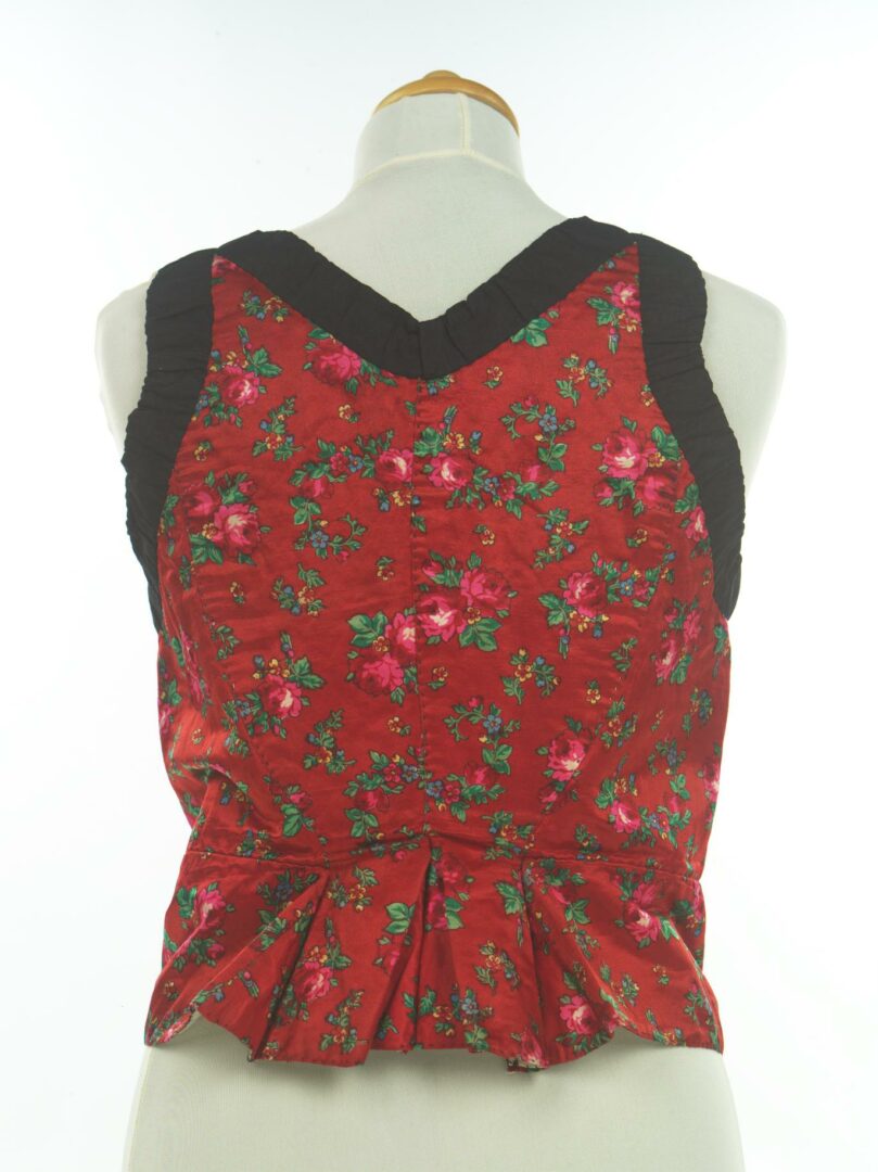 Živôtik je ušitý z hodvábneho atlasu s potlačeným kvetinovým vzorom. Podšitý je hustým továrenským plátnom. Olemovaný je čiernym farbiarskym plátnom. Na okrajoch predných dielov sú našité slučky z ostroružovej harasovej tkanice. Gombíky chýbajú.