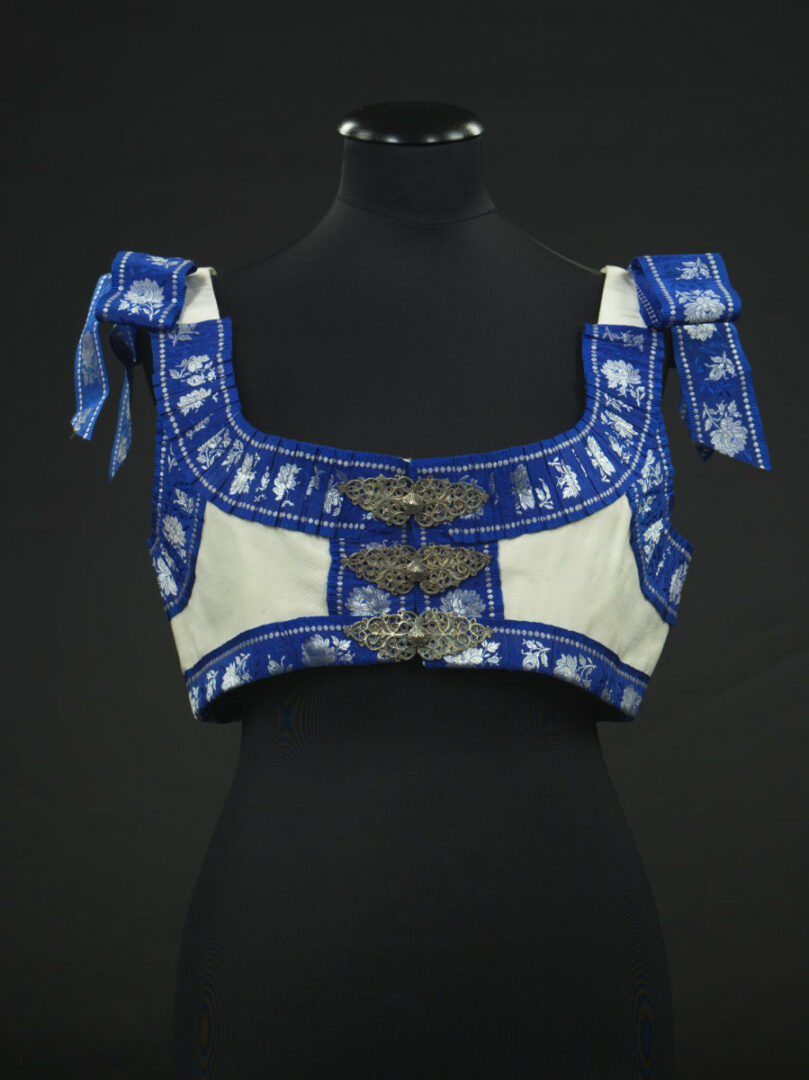 Živôtik z umelohodvábneho ripsu je podšitý hrubším domácim plátnom (možno ľan + bavlna). Olemovaný je hodvábnou stuhou, z ktorej sú aj mašle našité na ramenách. Zapína sa kovové háčiky a očká a na cínové spinky, ktoré boli pravdepodobne našité na staršom živôtiku. Ušitý je strojom aj ručne.