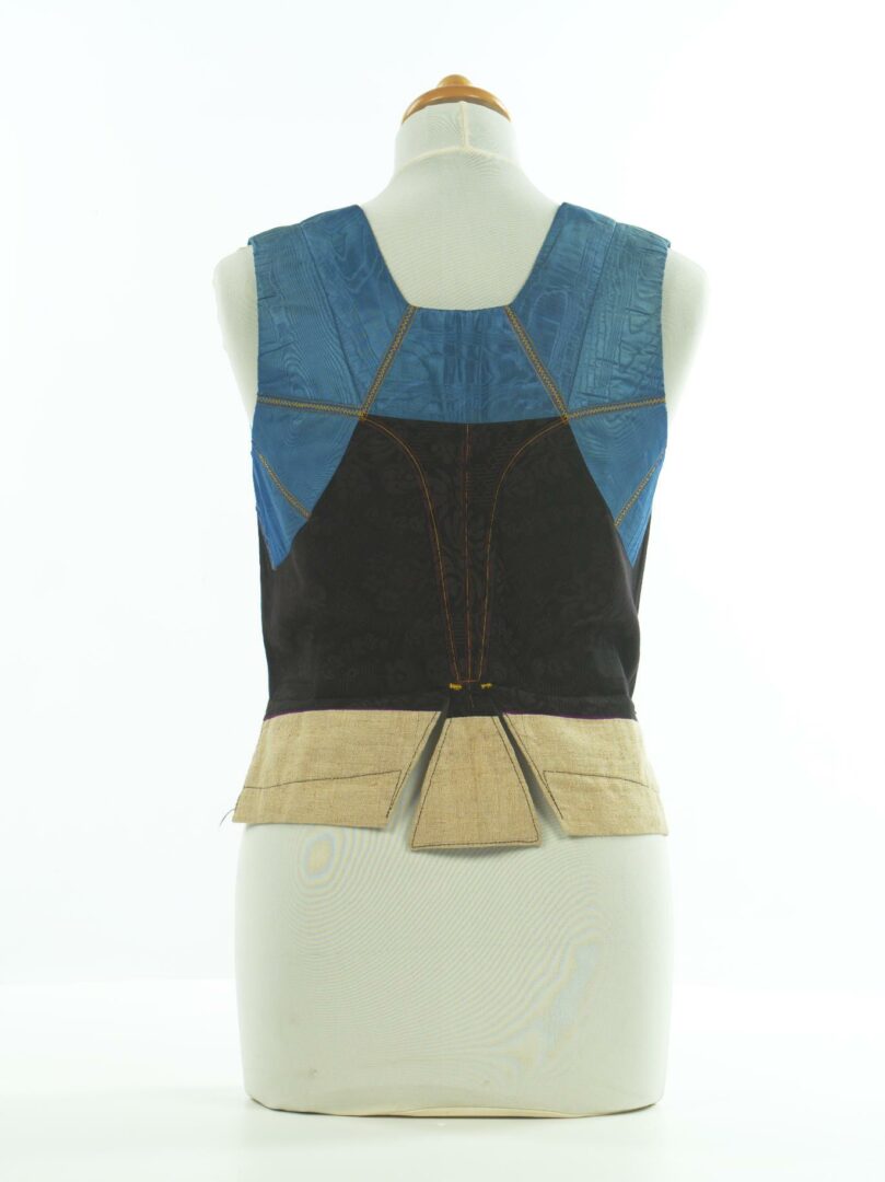 Živôtik je ušitý z čierneho damašku, podšitý je konopným plátnom. Olemovaný je širokými taftovými stuhami. Na predných dieloch je šnurovanie z kovových šnúr striebornej farby. Šnurovanie dopĺňa výšivka, drobné motívy šité pestrými bavlnkami. Na jednej strane prednej časti sú našité kovové gombíky striebornej farby. Živôtik je šitý strojom.
