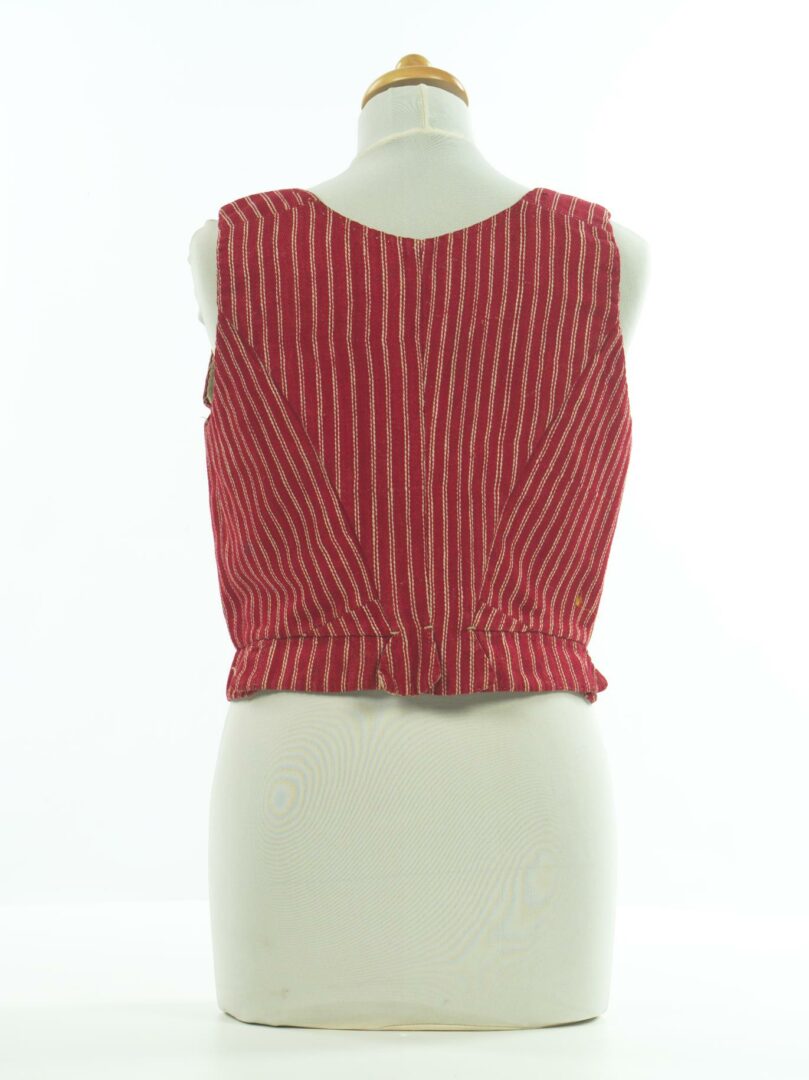 Ušitý je z ručne tkaného zmesového kepru (ľanová osnova, útok je bavlna), červená plocha je prerušovaná úzkymi bielymi pásikmi. Živôtik je podšitý hrubým ľanovým plátnom. Zapína sa na kovové gombíky s baníckym motívom zlatej farby .