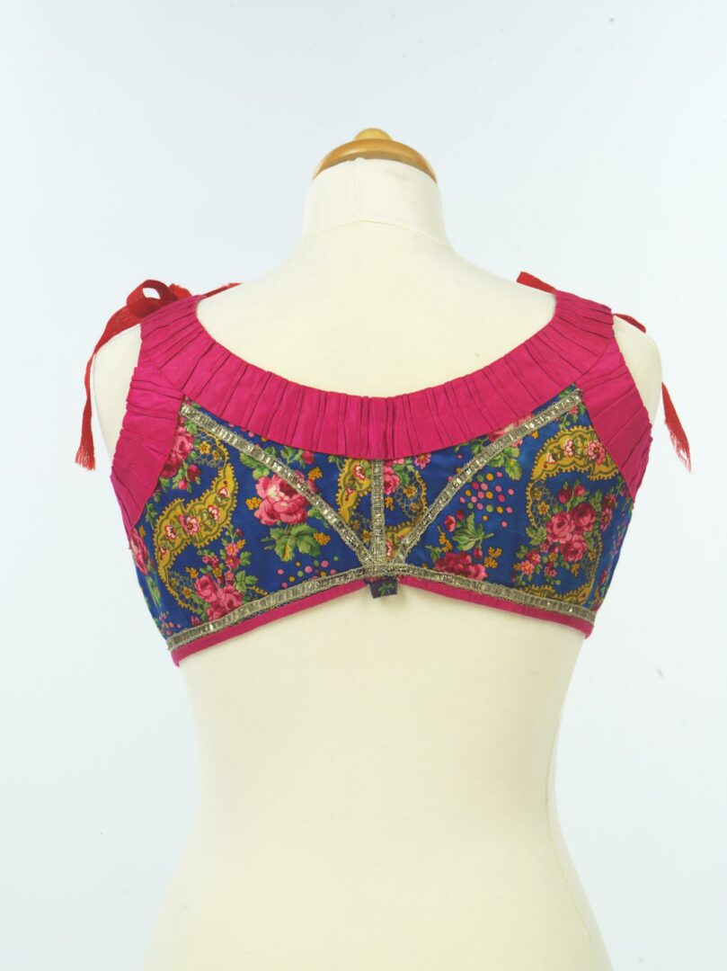 Živôtik je z hodvábneho atlasu modrej farby s potlačeným kvetinovým vzorom. Podšitý je bavlneným továrenským plátnom. Okraje sú olemované ružovým atlasom. Okraje výstrihu a prieramky lemuje ozdobne naskladaný širší pásik toho istého atlasu. Na živôtiku sú našité úzke stuhy z kovovej nite striebornej farby. Živôtik nie je na pleciach zošitý, ramienka majú na koncoch ušité slučky, cez ktoré sa zväzovali harasovovu tkanicou. Živôtik sa zapína na kovové háčiky a očká. Na jednom okraji zapínania sú našité ozdobné kovové gombíky.