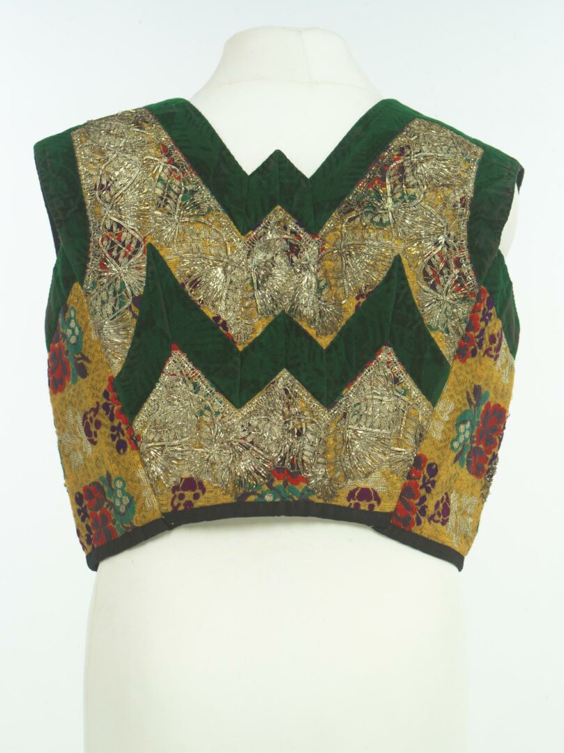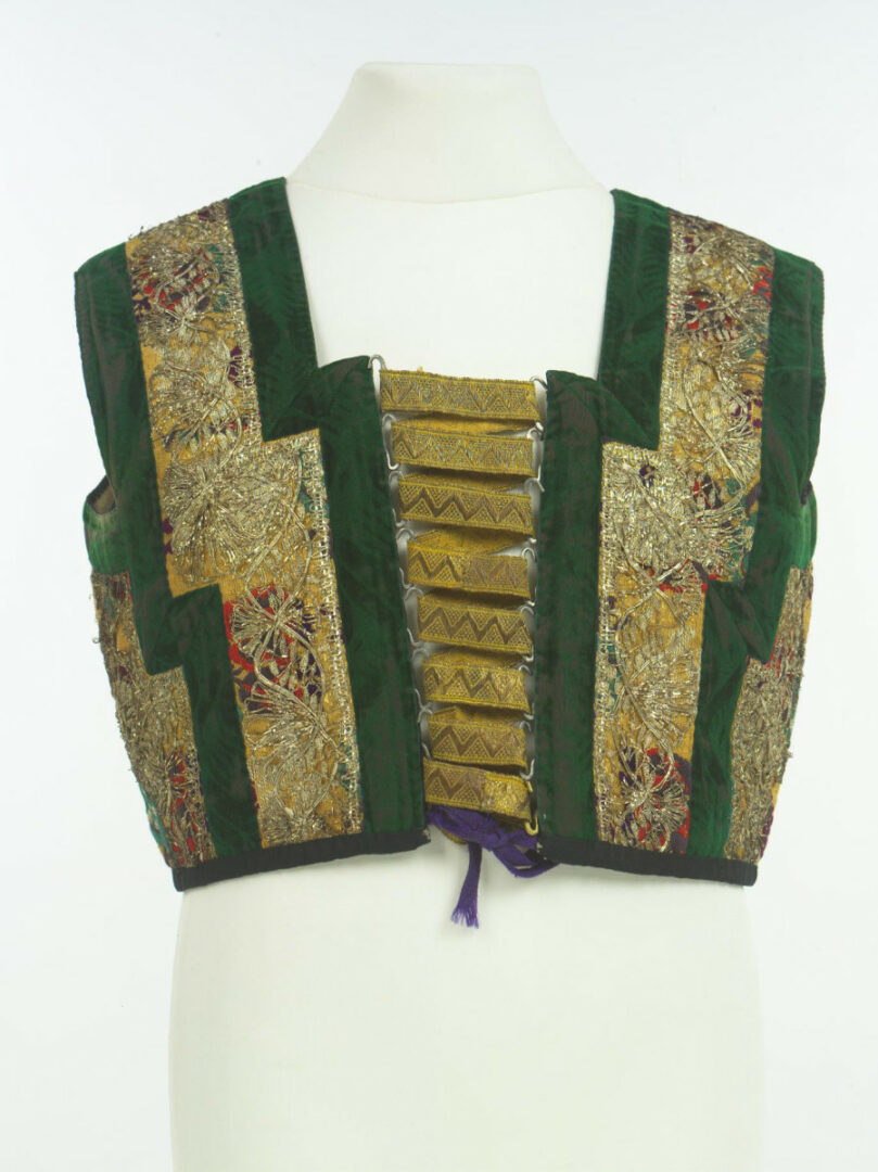 Živôtik z kvetovaného brokátu je podšitý konopným plátnom. Na živôtiku sú našité zamatové stuhy a čipky z kovovej nite striebornej farby. Predné okraje sú vystužené pravdepodobne drevenou výstužou. V hrane predných dielov sú všité kovové háčiky, cez ktoré je navlečená šnurovačka, žakárová stuha zlatej farby. Dolný okraj živôtika je olemovaný čiernym plátnom. K okrajom lemu je prišitá fialová haraska na zaviazanie živôtika.