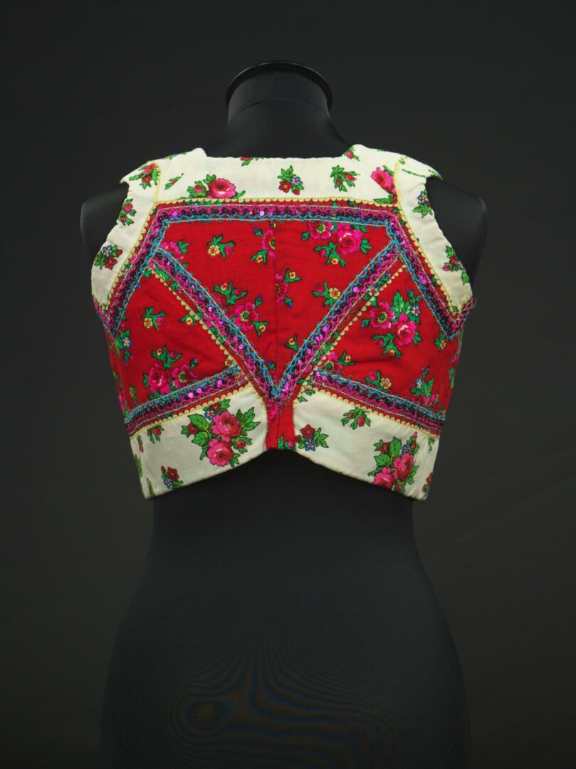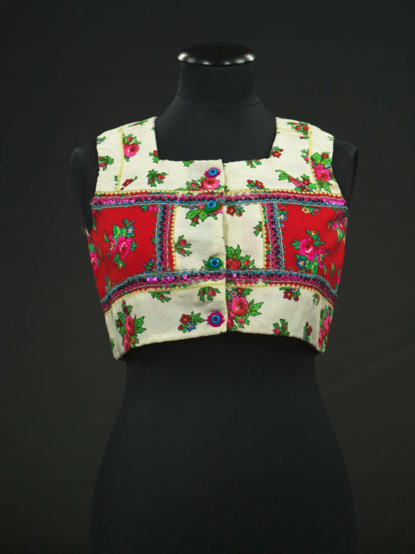 Živôtik je ušitý z kvetovaného kašmíru červeného a bieleho. Podšitý je domácim plátnom. Ozdobený je našitou bortňou. Okolo lemov je všitá vlnená hadovka. Živôtik sa zapína na sklenené modré gombíky. Dierky sú obšité farebnou vlnenou priadzou.