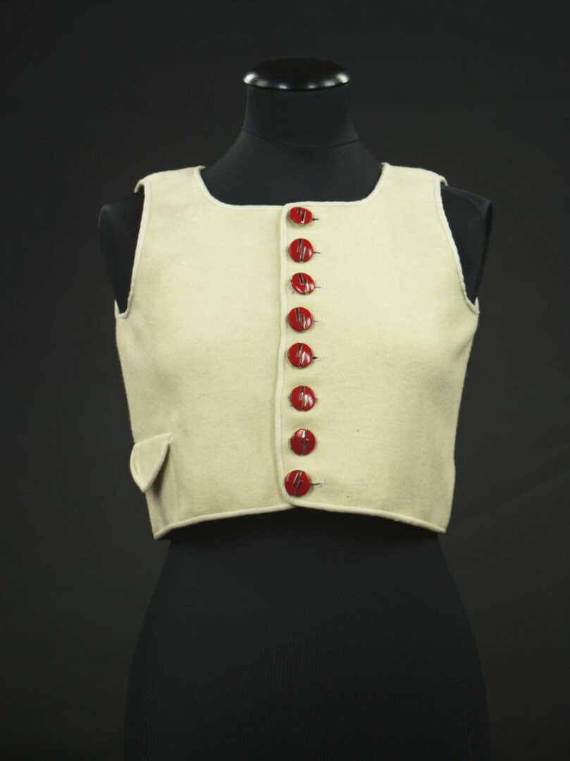 Ušitý je z nebieleného nefarbeného súkna. Podšitý je hrubším konopným plátnom. Všetky okraje sú olemované bielou bavlnenou keprovkou. Zapína sa na kovové zafarbené gombíky.