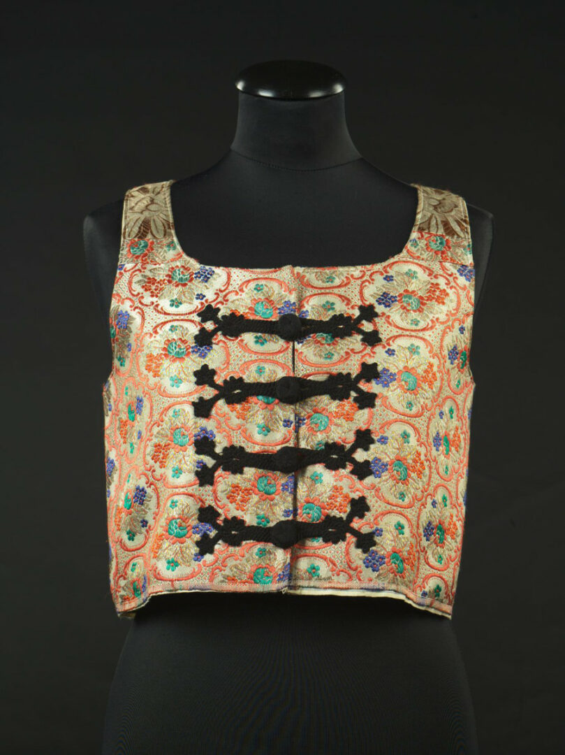 Živôtik je z umelohodvábneho brokátu. Podšitý je sypkovinou. Na zadnej časti je cez chrbtové švíky našitá ozdoba z kovových nití striebornej farby. Zapínanie je z čiernych textilných gombíkov a ozdobných slučiek.