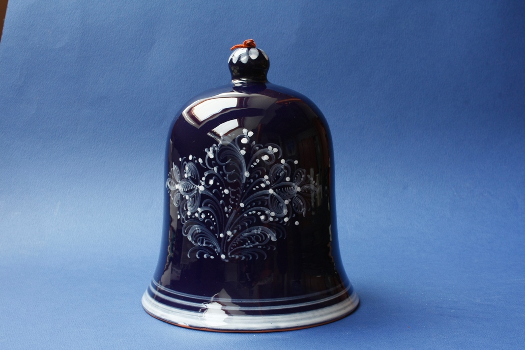 Ručne točený na hrnčiarskom kruhu, poliaty modrou glazúrou, maľovaný biely rastlinný, alebo geometrický dekor. Možné inofarebné varianty.