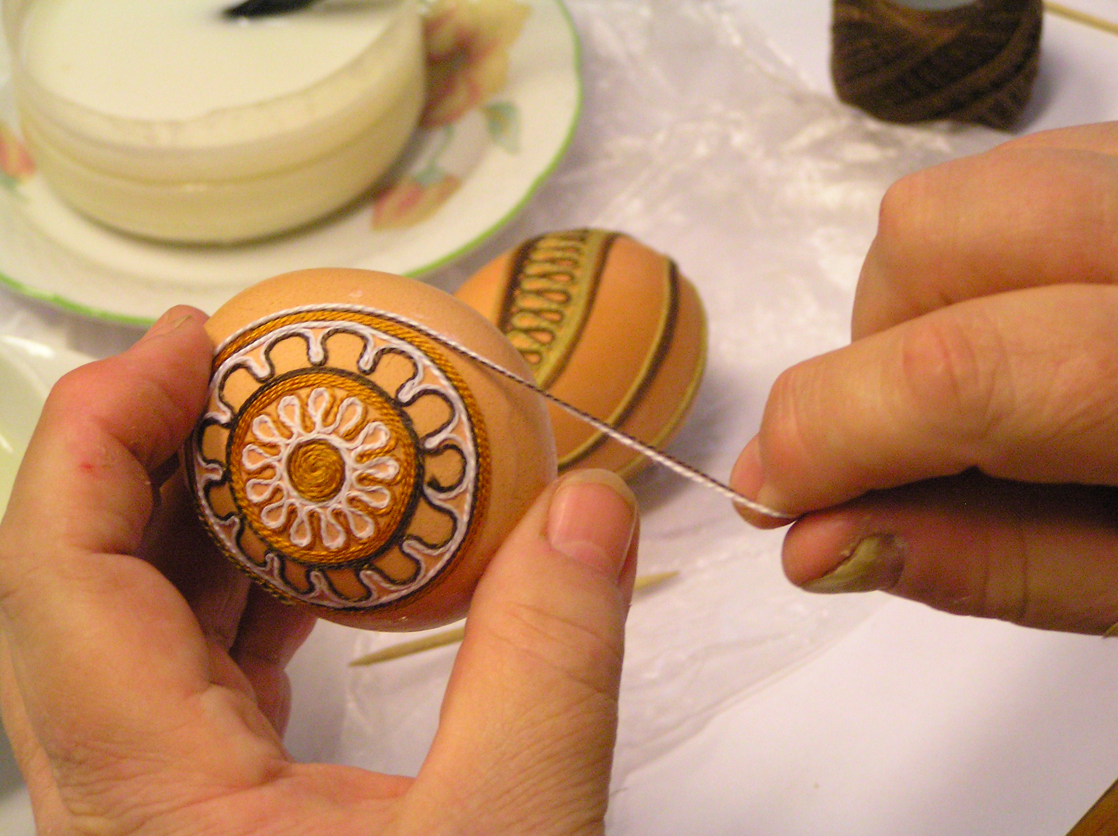 Vyfúknuté vajíčko natiera rozriedeným lepidlom z bielej lepiacej pasty. Po zaschnutí natiera kúsok, ktorý práve chce oblepovať, tenkým štetcom a aplikuje naň bavlnku. Aby sa dala dobre tvarovať, nesmie lepidlom presiaknuť. Vajce možno pri práci držať len na suchom mieste, aj preto zdobí naraz aj desať kusov. Pri niektorých vzoroch si na vajci ceruzkou naznačí stredovú čiaru, od ktorej sa bavlnka odvíja už akoby sama.